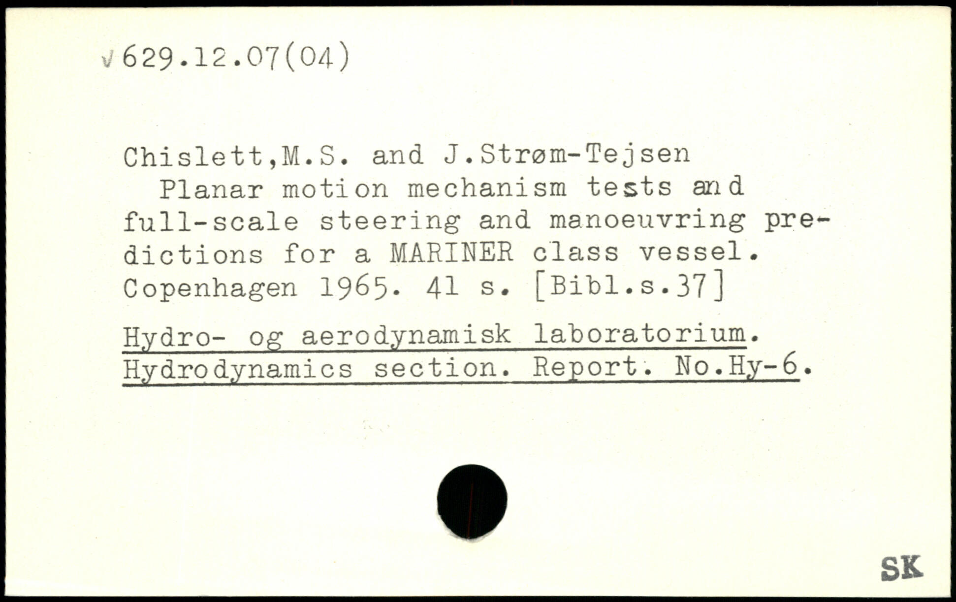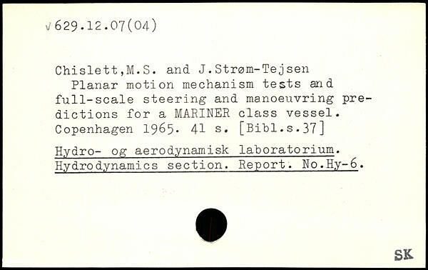 Chislett,M.S. and J.Strøm-Tejsen Planar motion mechanism tests and full-scale steering and manoeuvring predictions for a MARINER class vessel. Copenhagen 19&5.