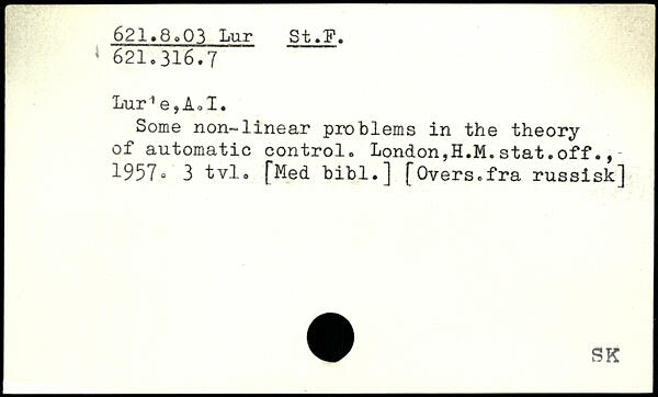 Lurie,loI. Some non-linear problems in the theory of automatic control. London,H.M.stat.off.,. 1957® 3 tvl. fMed bibl.] [Overs.fra russisk]