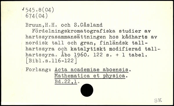 Bruun,H<,Ho och S,Gåsland Fördelningskromatografiska studier av hartssyrasammansättningen hos kådharts av nordisk tall och gran, finländsk tall-hartssyra och katalytiskt modifierad tallharts syra 0 Åbo 19600