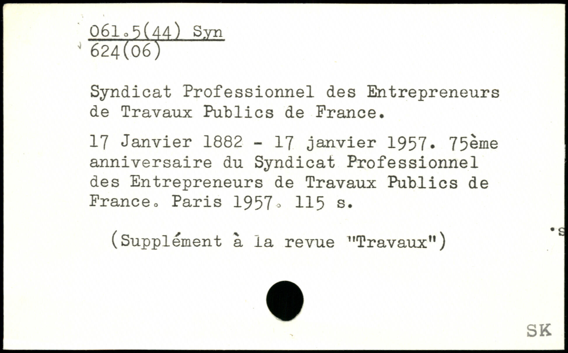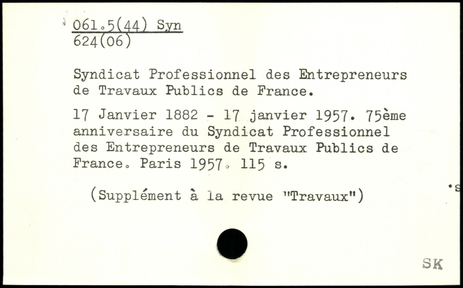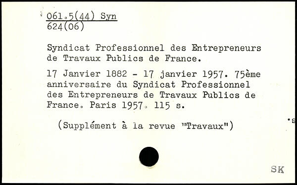 Syndicat Professionnel des Entrepreneurs de Travaux Publics de France. 17 Janvier 1882 - 17 janvier 1957, 75ème anniversaire du Syndicat Professionnel des Entrepreneurs de Travaux Publics de Franceo