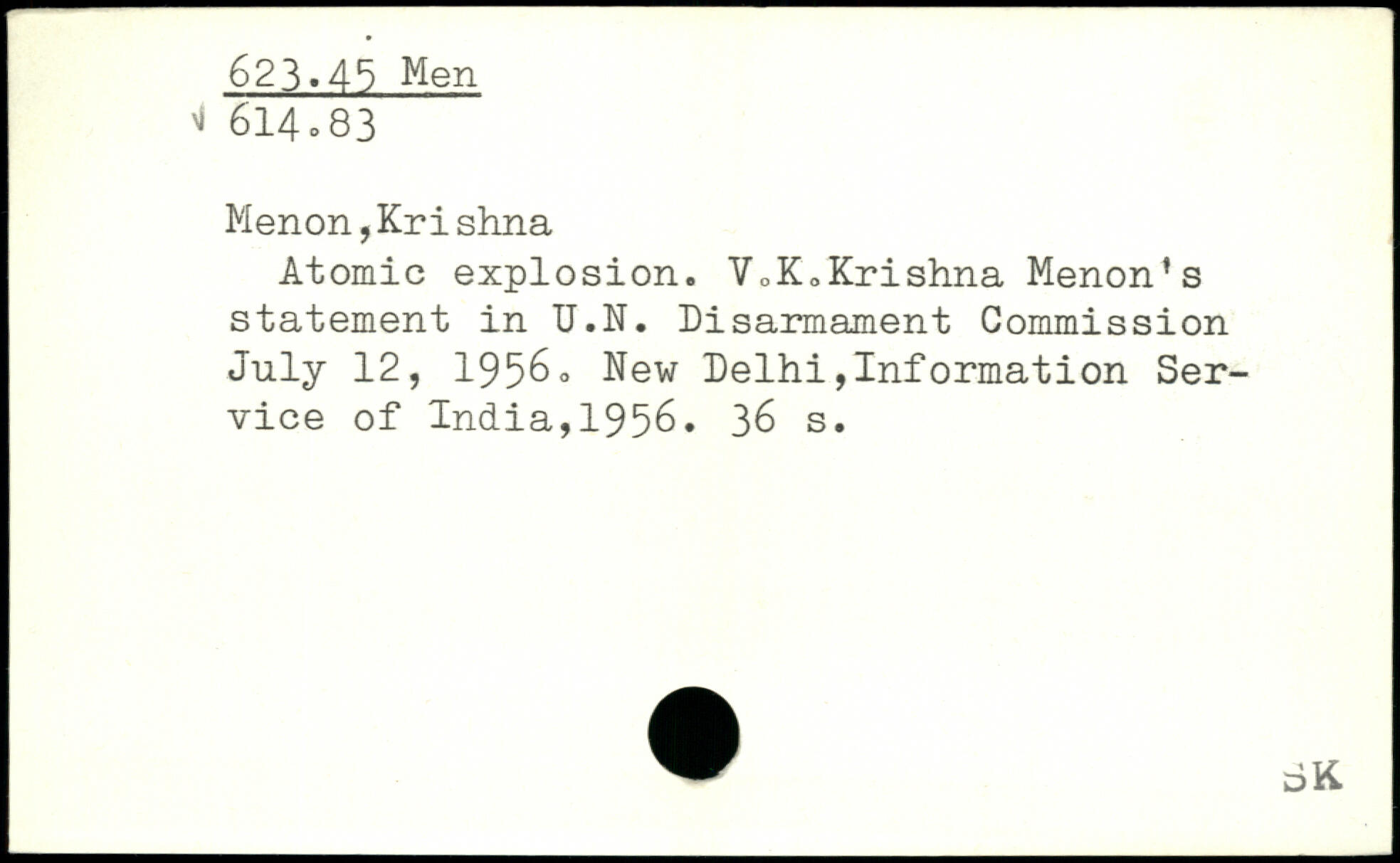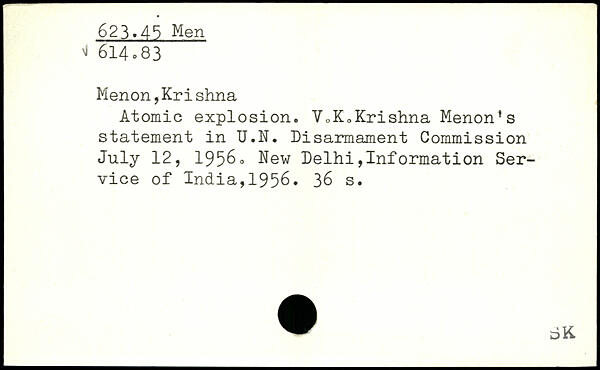 Atomic explosion. V.K,Krishna Menon’s statement in U.N. Disarmament Commission July 12, 1956o
