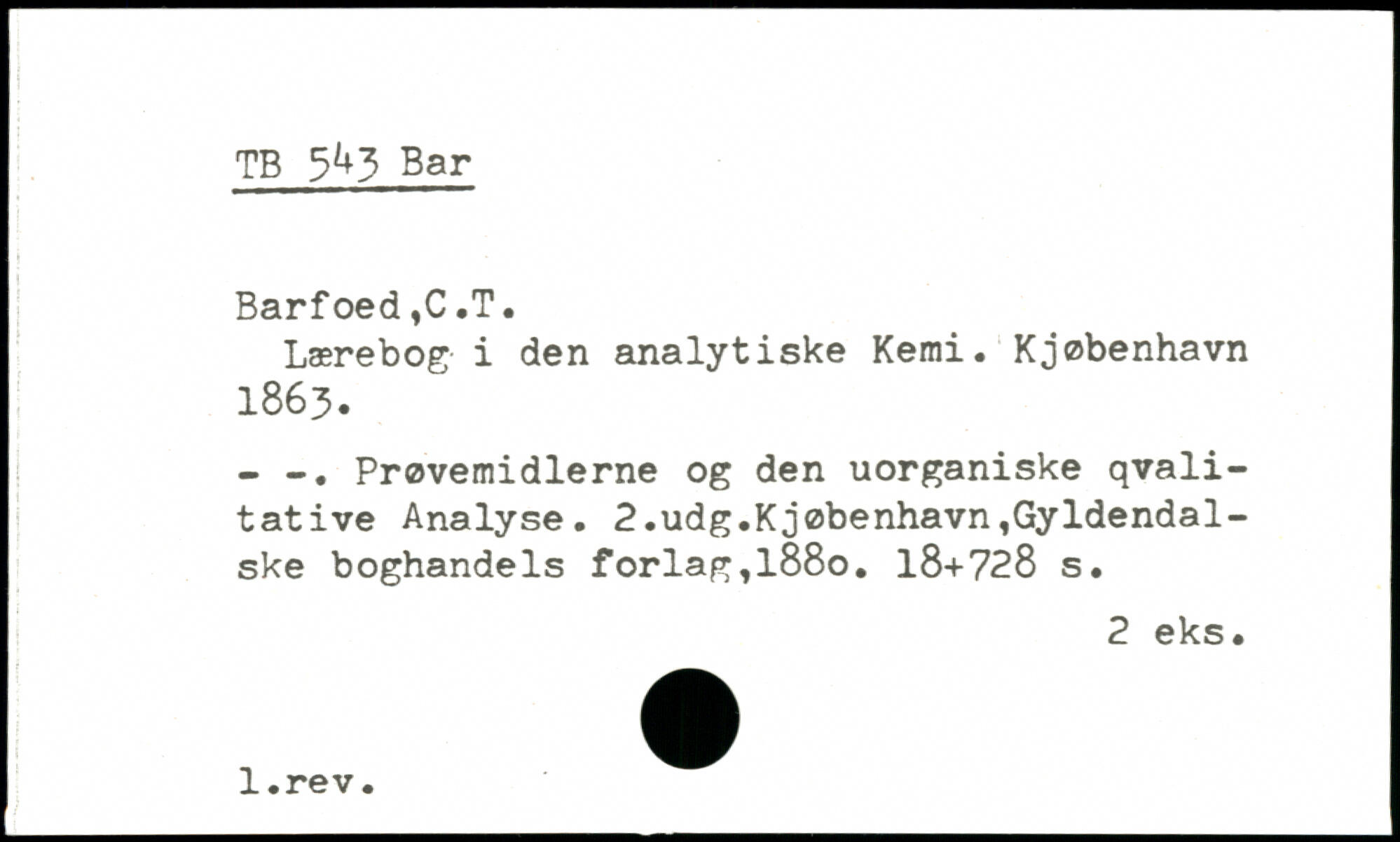TB 5^3 Bar Barfoed,C.T. Lærebog i den analytiske Kemi. Kjøbenhavn 1863. - Prøvemidlerne og den uorganiske qvali-tative Analyse.