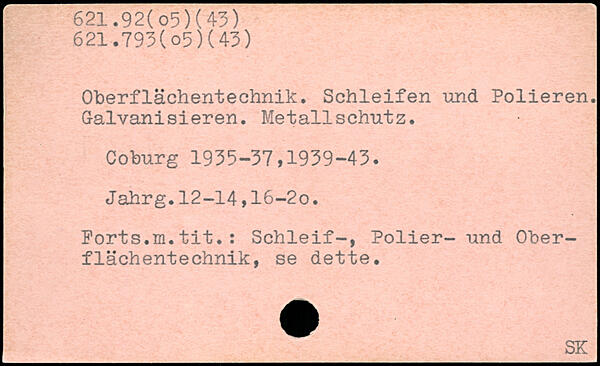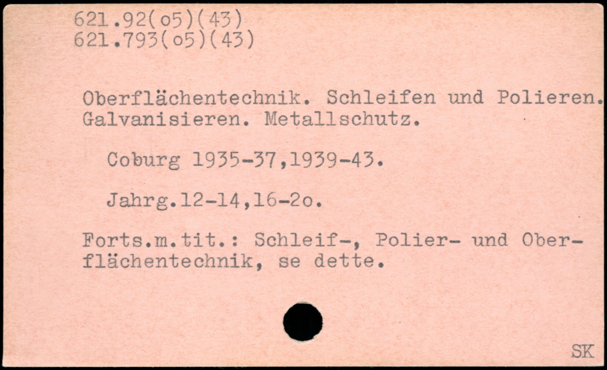 Oberflächentechnik. Schleifen und Polieren. Galvanisieren. Metallschutz. Coburg 1935-37>1939-43. Jahrg.12-14 >16-2o. Ports.m.tit.: Schleif-, Polier- und Oberflächentechnik, se dette.