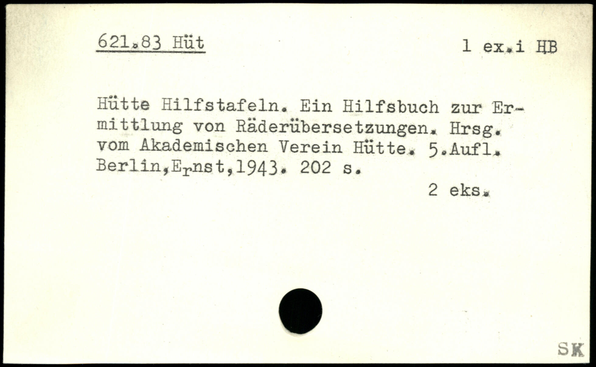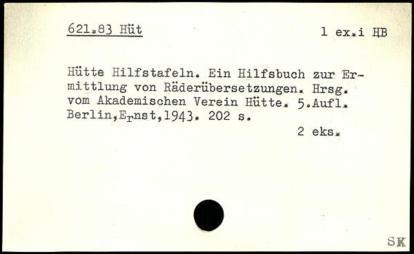 Hütte Hilfstafeln. Ein Hilfsbuch zur Ermittlung von Räderübersetzungen. Hrsg, vom Akademischen Verein Hütte.