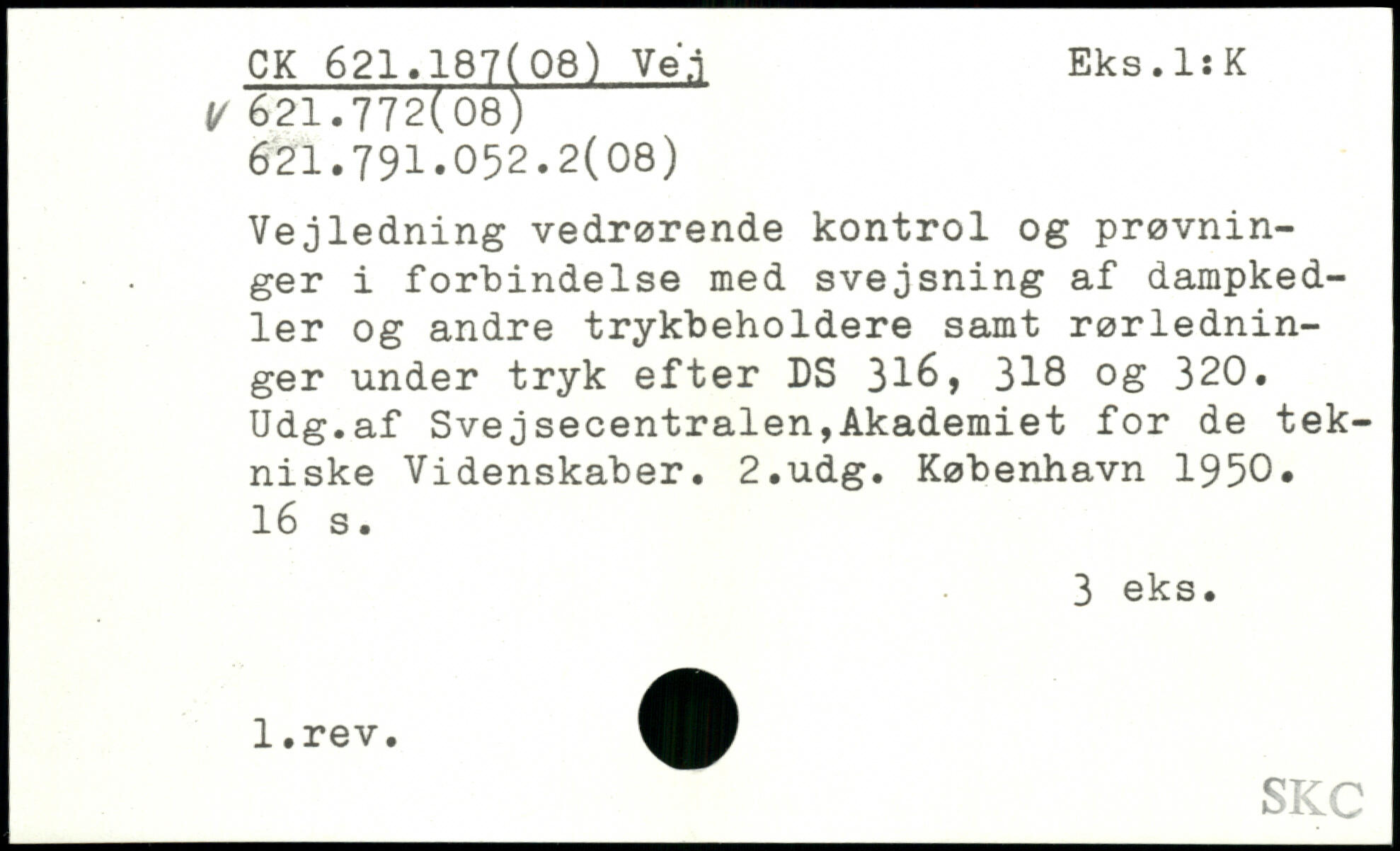 Vejledning vedrørende kontrol og prøvninger i forbindelse med svejsning af dampkedler og andre trykbeholdere samt rørledninger under tryk efter DS 316, 318 og 320. Udg.af Svejsecentralen,Akademiet for de tekniske Videnskaber.