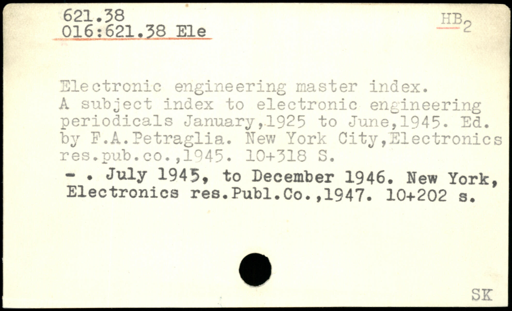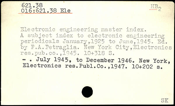 Electronic engineering master index. A subject index to electronic engineering periodicals January,1925 to June71945. Ed. by F.A.Petraglia. New York City/Electronics res.pub.co.,1945.