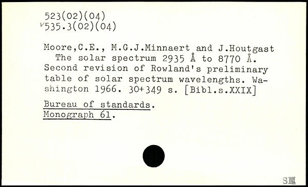 Moore,C.E., M.G.J.Minnaert and J.Houtgast The solar spectrum 2935 A to 8770 A. Second revision of Rowland’s preliminary table of solar spectrum wavelengths.