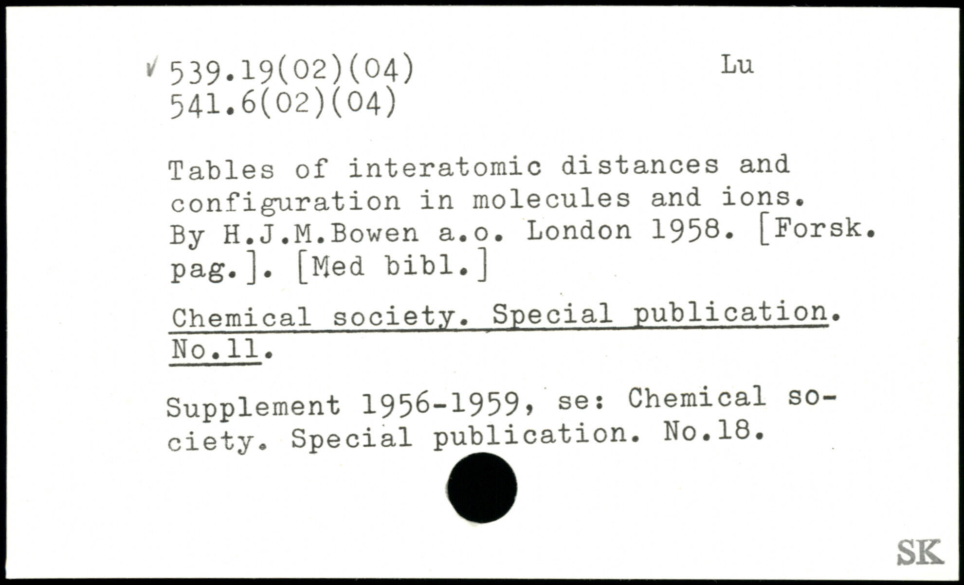 Tables of interatomic distances and configuration in molecules and ions. By H.J.M.Bowen a.o.