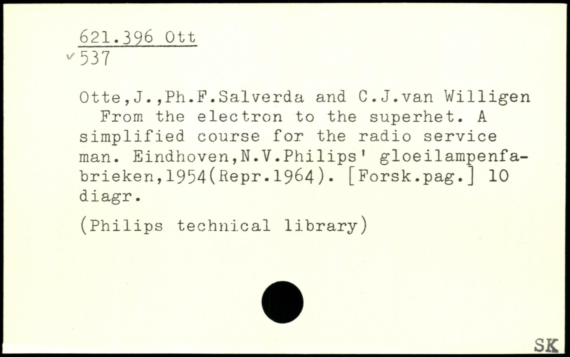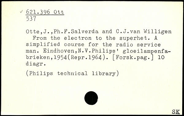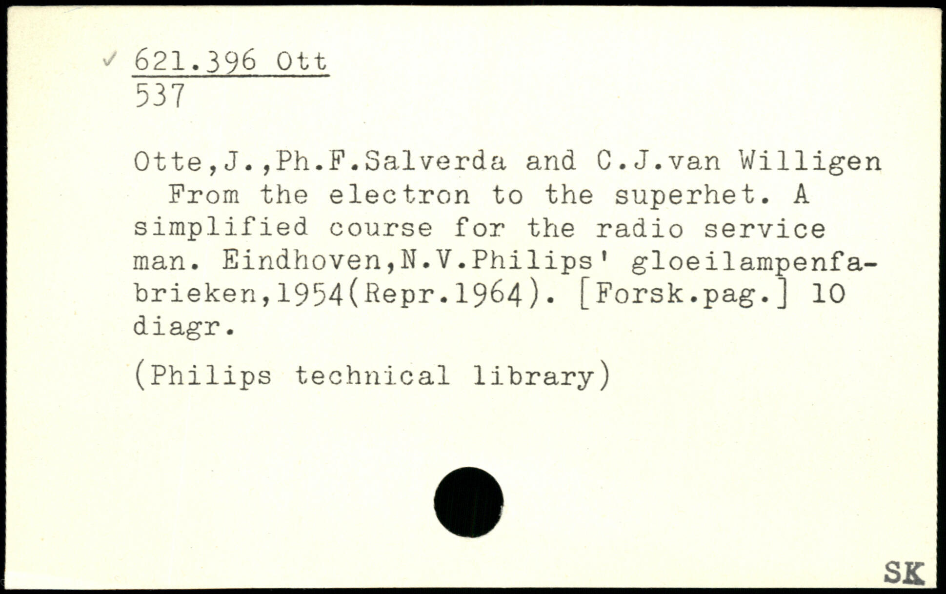 Otte,J.,Ph.F.Salverda and C.J.van W1111gen From the electron to the superhet. A simplified course for the radio service man. Eindhoven,N.V.Philips 1 gloeilampenfa-brieken,1954(fiepr.1964).