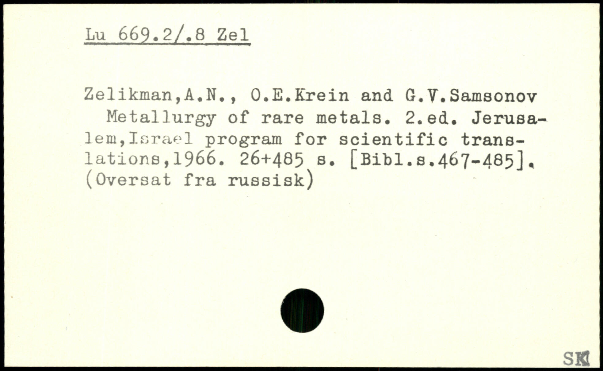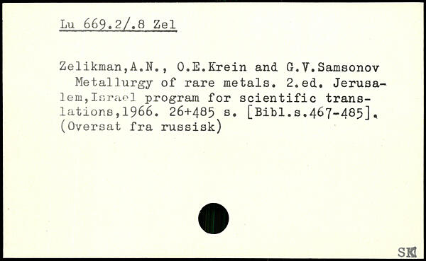 Zelikman,A.N., O.E.Krein and G.V.Samsonov Metallurgy of rare metals.