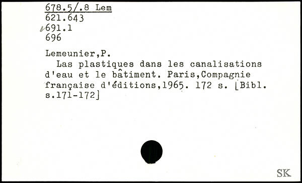 Las plastiques dans les canalisations d'eau et le bâtiment. Paris,Compagnie française d'éditions,1965.