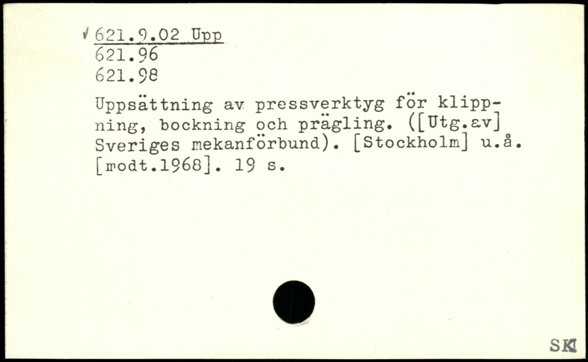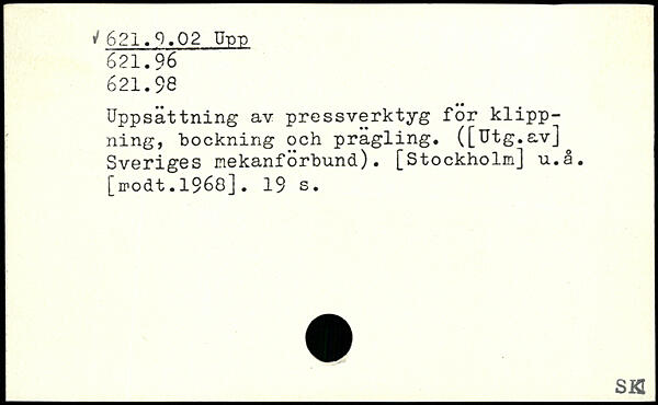 Uppsättning av pressverktyg for klippning, bockning och prägling. ([Utg.av] Sveriges mekanförbund). [Stockholm] u.å.