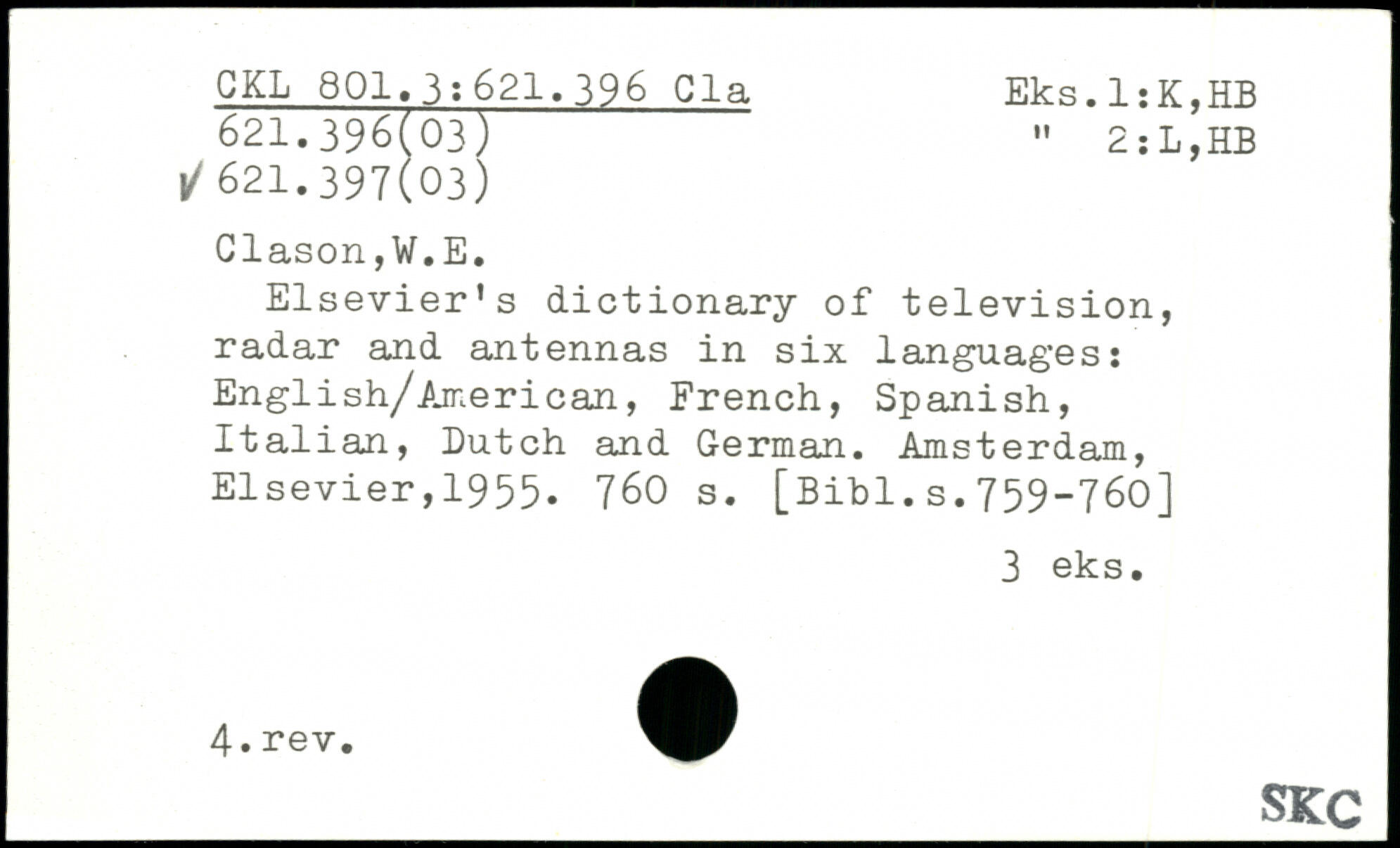 Elsevier’s dictionary of television, radar and antennas in six languages: English/American, French, Spanish, Italian, Dutch and German.