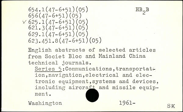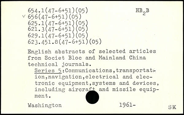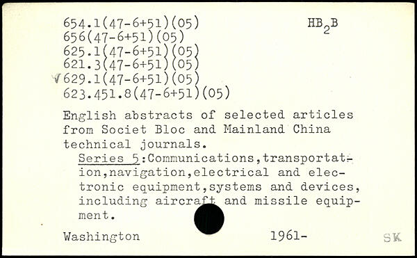 English abstracts of selected articles from Societ Bloc and Mainland China technical journals. Series 5:Communications,transportation,navigation, electrical and electronic equipment,systems and devices, including aircraft and missile equipment.