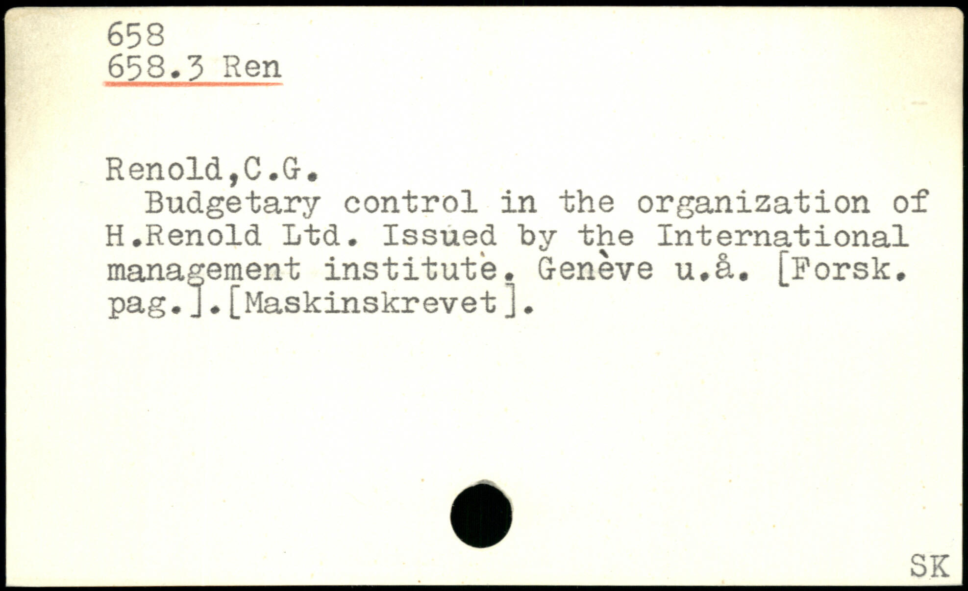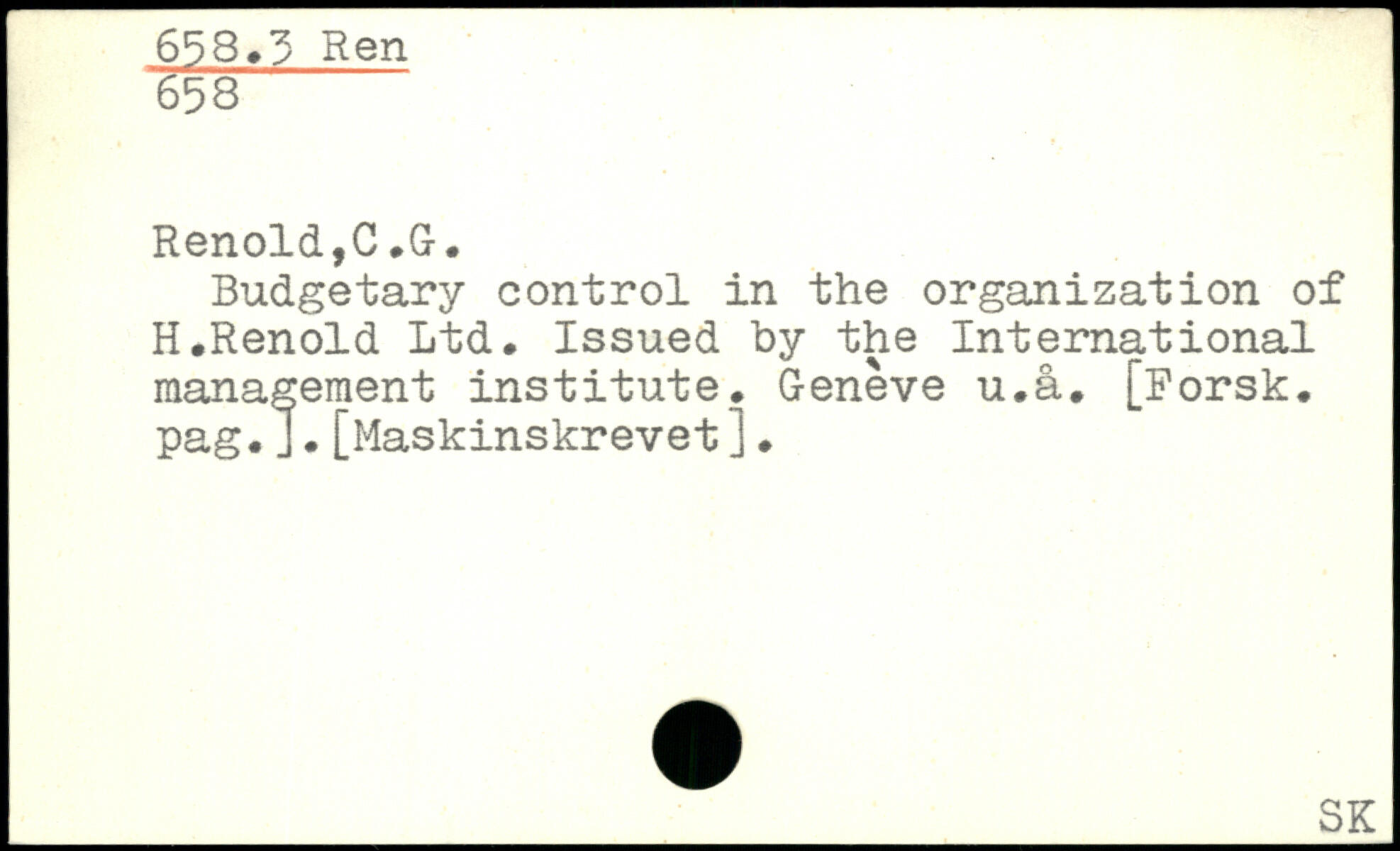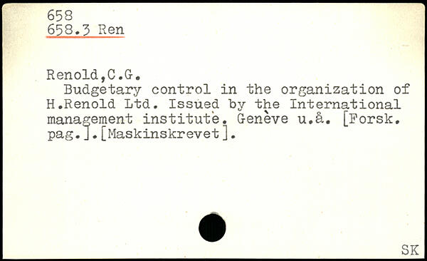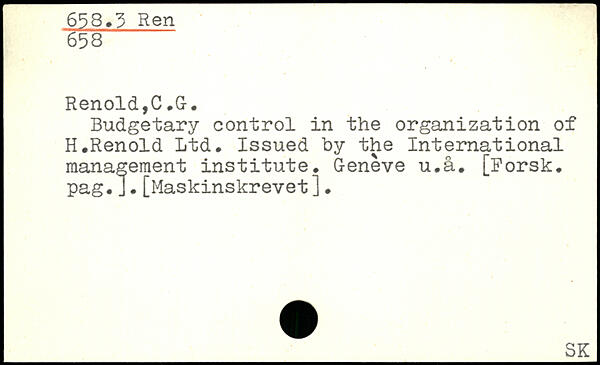 Budgetary control in the organization of H.Renold Ltd. Issued by the International management institute. Geneve u.å. [Forsk, pag.J.[Maskinskrevet J.