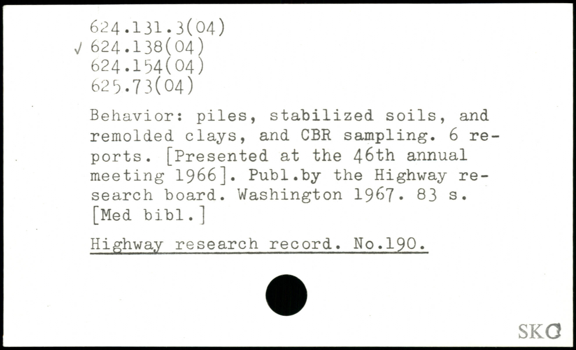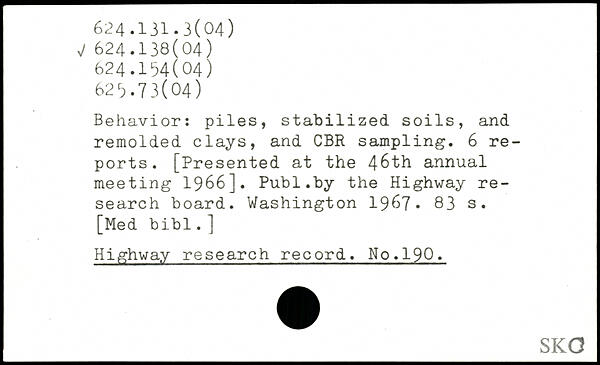 Behavior: piles, stabilized soils, and remolded clays, and CBR sampling. 6 reports. [Presented at the 46th annual meeting 1966].
