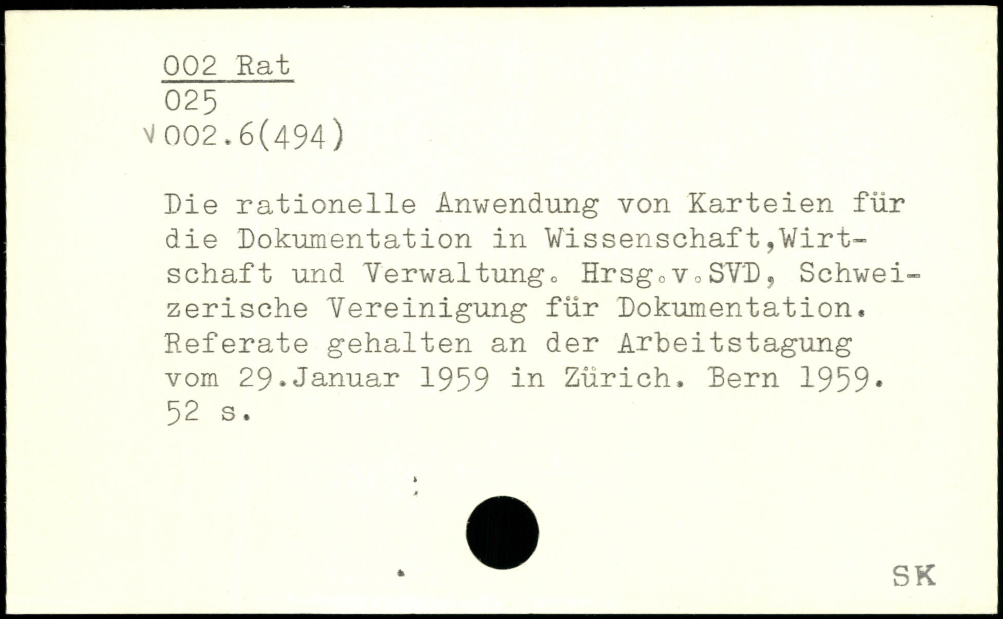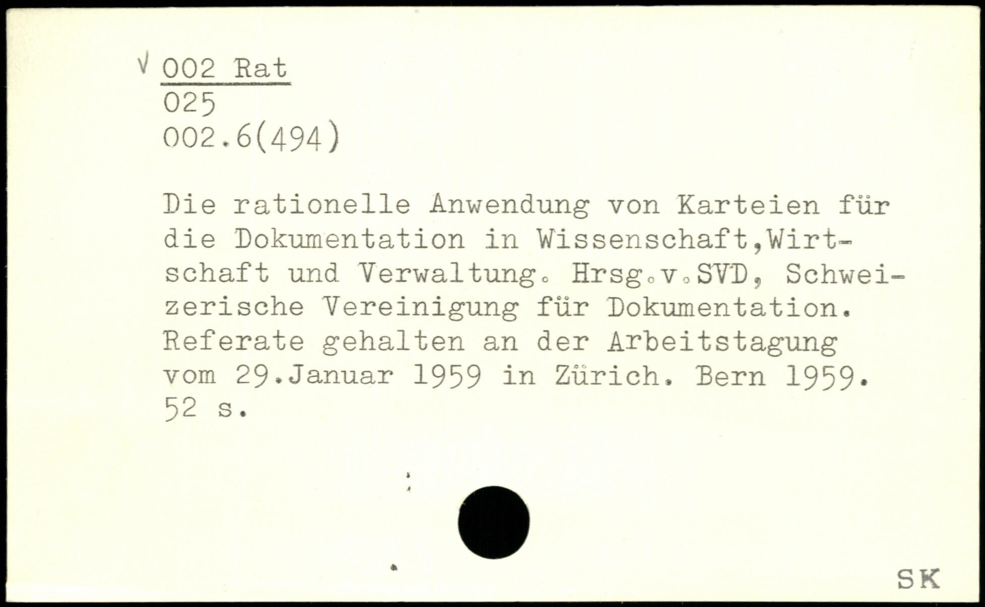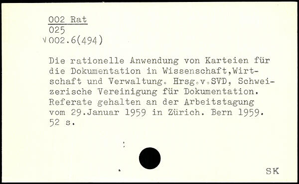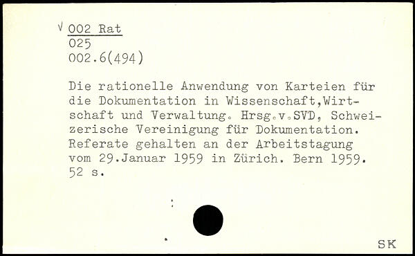 Die rationelle Anwendung von Karteien für die Dokumentation in Wissenschaft,Wirtschaft und Verwaltung,, Hrsg0v0SVD, Schweizerische Vereinigung für Dokumentation. Referate gehalten an der Arbeitstagung vom 29.Januar 1959 in Zürich.