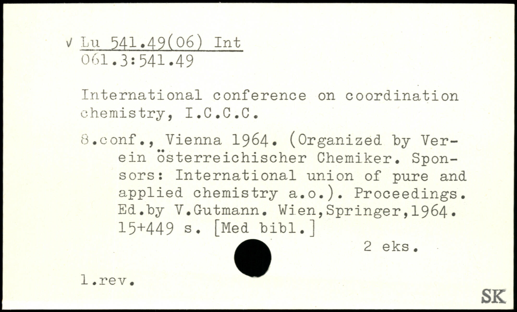 International conference on coordination chemistry, I.C.C.C. B.conf., Vienna 1964. (Organized by Verein österreichischer Chemiker. Sponsors: International union of pure and applied chemistry a.o.). Proceedings. Ed.by V.Gutmann.