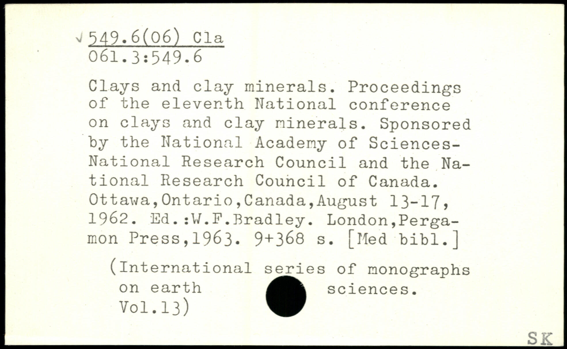 Clays and clay minerals. Proceedings of the eleventh National conference on clays and clay minerals. Sponsored by the National Academy of Sciences-National Research Council and the National Research Council of Canada. Ottawa,Ontario,Canada,August 13-17, 1962. Ed.:V.F.Bradley.