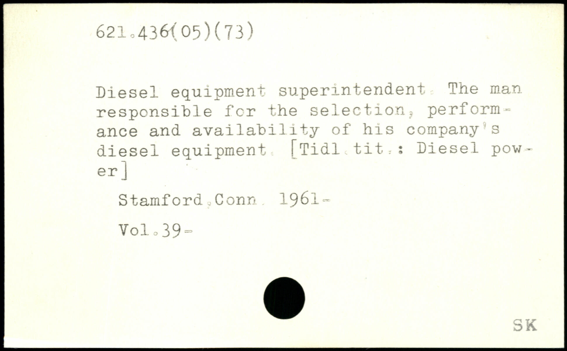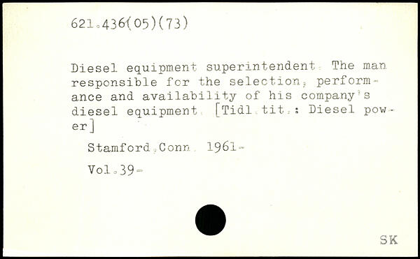 Diesel equipment superintendent The man responsible for the selection, performance and availability of his company s diesel equipment [Tidl tit,; Diesel power ] Stamford Conn 1961- Volo 39 =