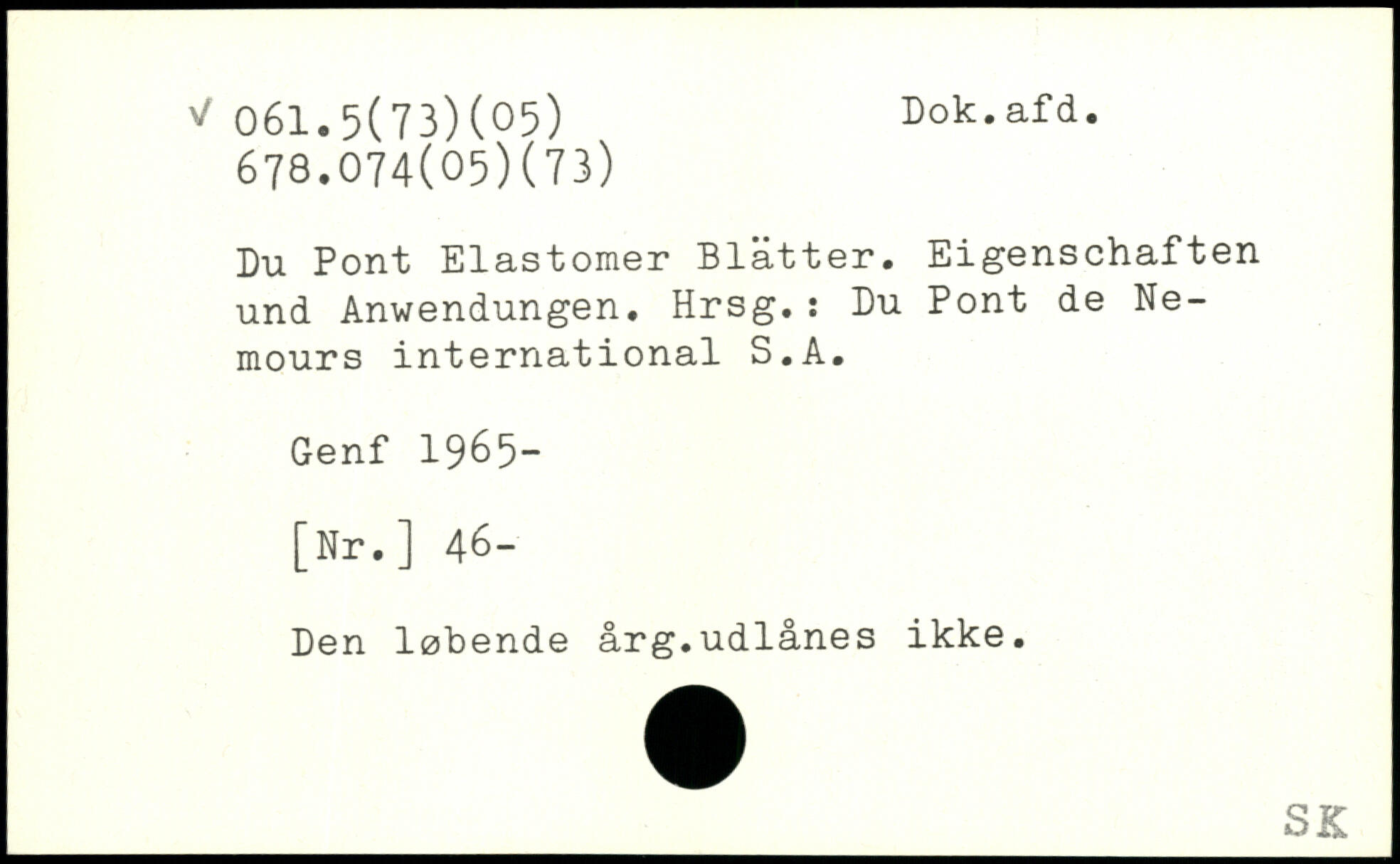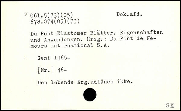 Du Pont Elastomer Blätter. Eigenschaften und Anwendungen. Hrsg.: Du Pont de Nemours international S.A. Genf 1965- [Nr.] 46- Den løbende årg.udlånes ikke.