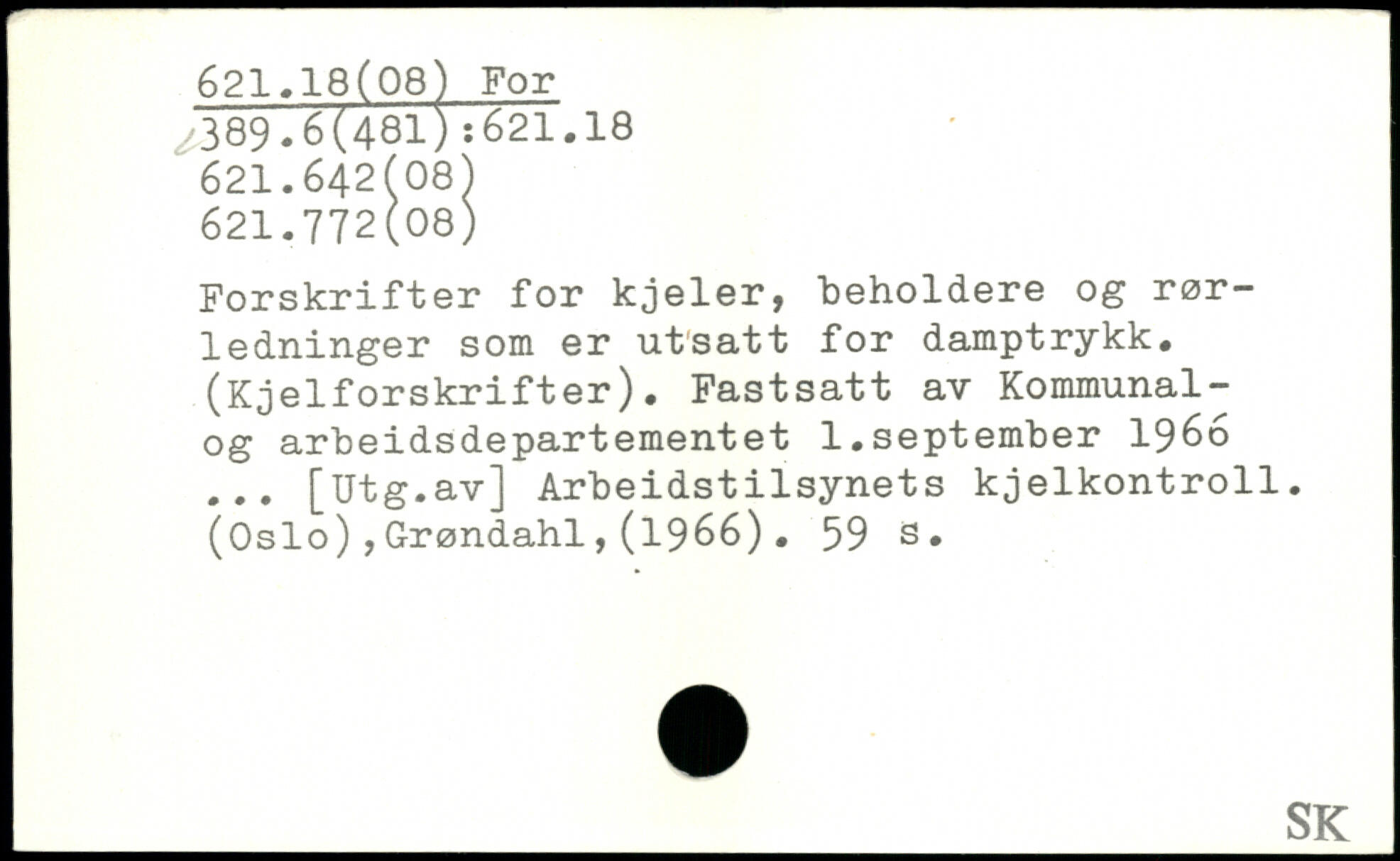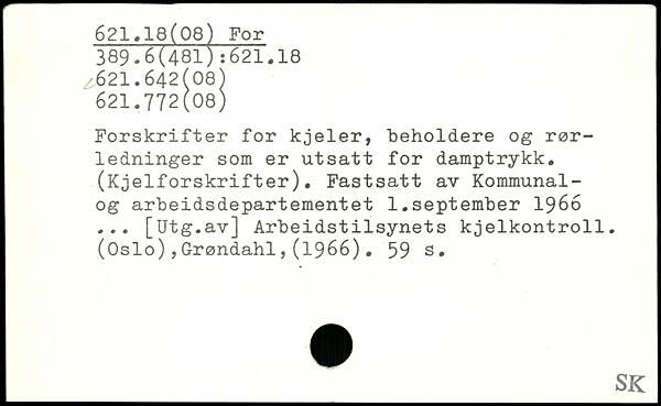 Forskrifter for kjeler, beholdere og rørledninger som er utsatt for damptrykk. (Kjelforskrifter). Fastsatt av Kommunal-og arbeidsdepartementet 1.september 1966 ... [Utg.av] Arbeidstilsynets kjelkontroll. (Oslo),Grøndahl,(1966).