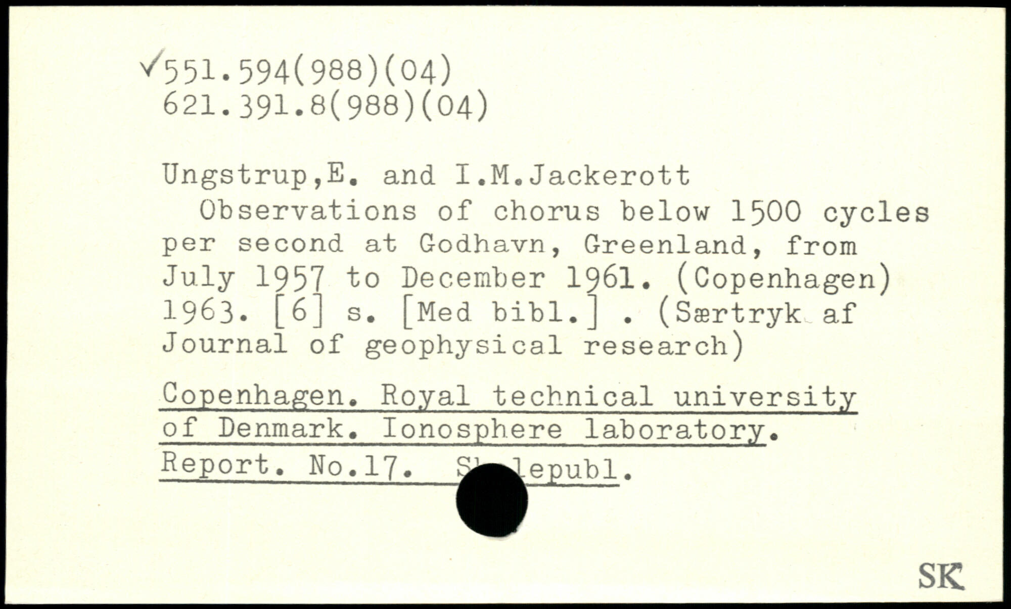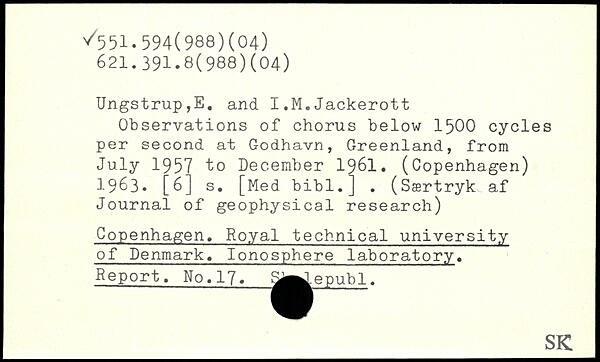 Observations of chorus below 1500 cycles per second at Godhavn, Greenland, from July 1957 to December 1961. (Copenhagen) 1963. [6] s.