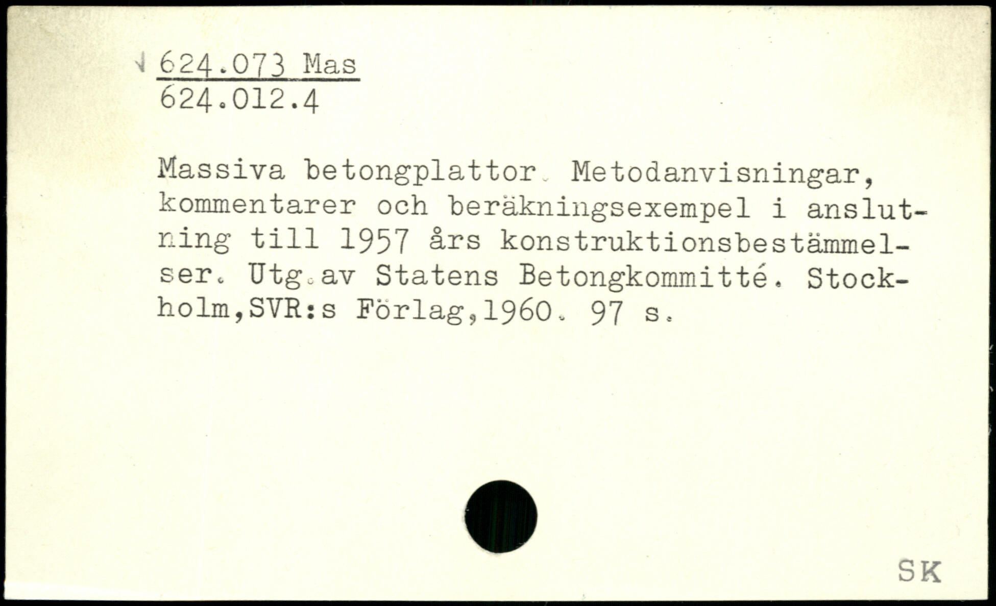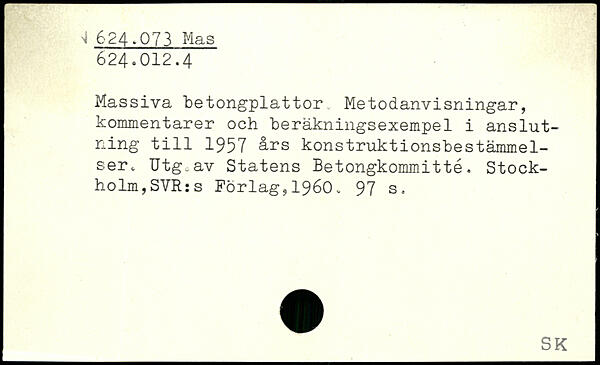 Massiva betongplattor, Metodanvisningar, kommentarer och beräkningsexempel i anslutning till 1957 års konstruktionsbestämmel-ser. Utg.av Statens Betongkommitté. Stockholm, SVR:s Förlag,1960.