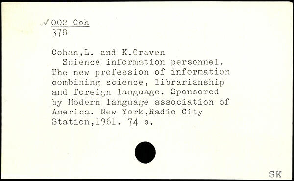 Science information personnel. The new profession of information combining science, librarianship and foreign language. Sponsored by Modern language association of America.