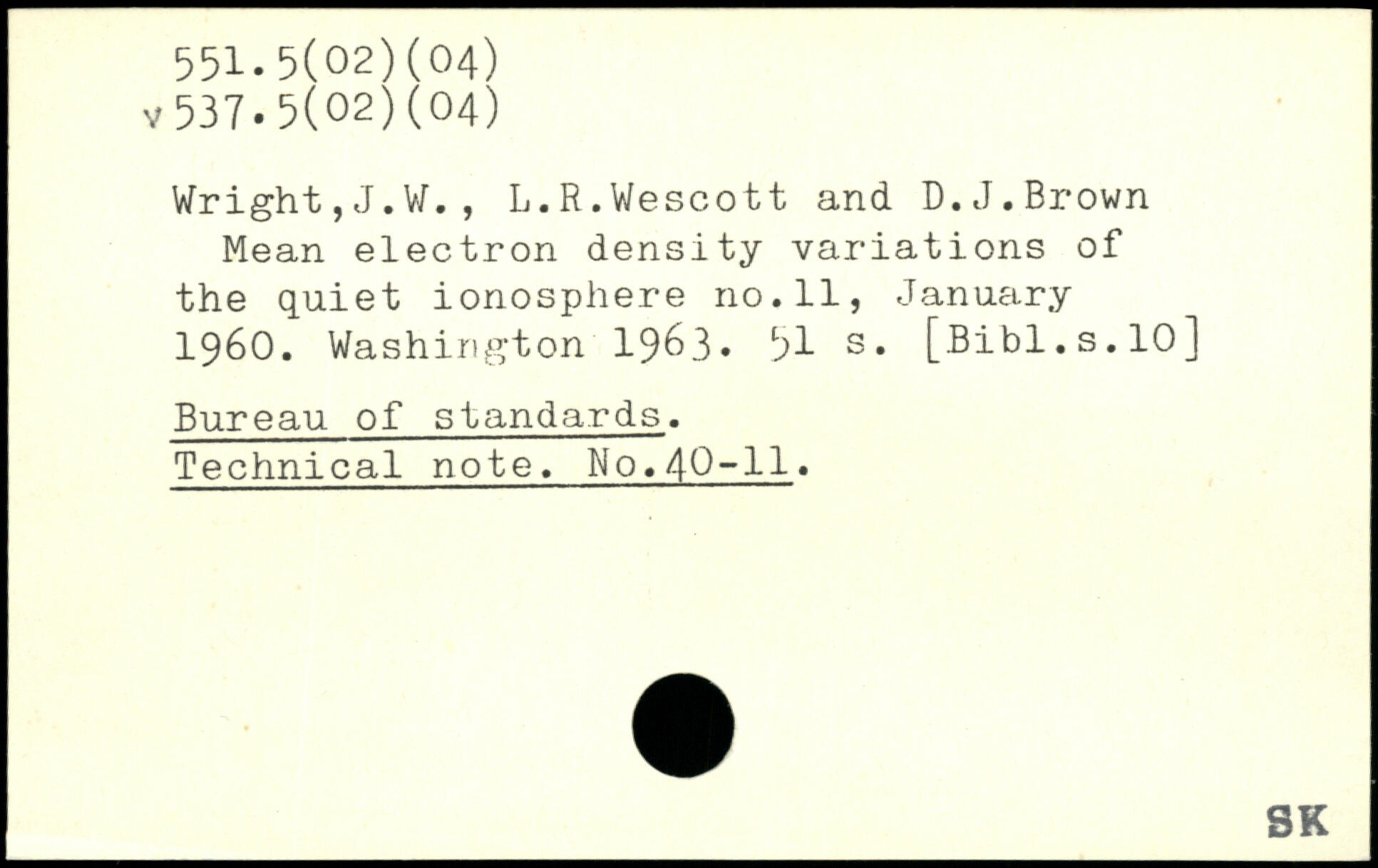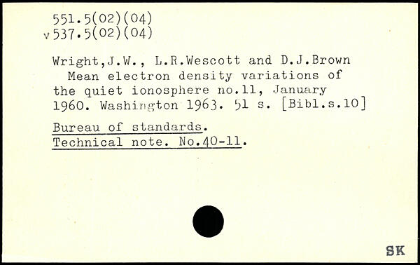 Wright,J.W., L.R.Wescott and D.J.Brown Mean electron density variations of the quiet ionosphere no.11, January 1960.