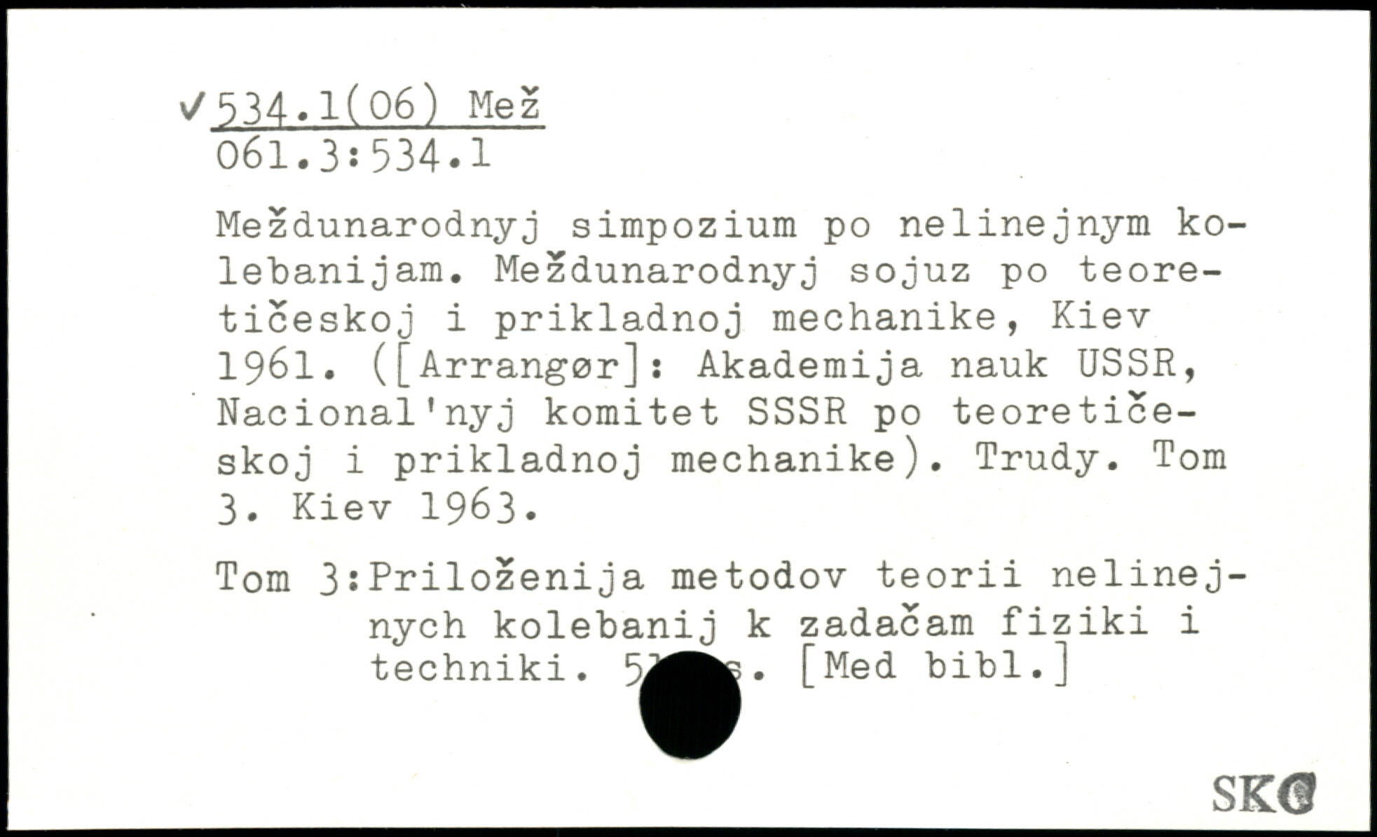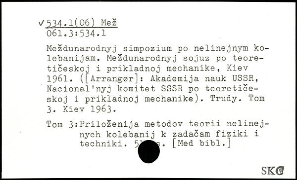 Mezdunarodnyj simpozium po nelinejnym ko-lebanijam. Mezdunarodnyj sojuz po teore-ticeskoj i prikladnoj mechanike, Kiev 1961. ([Arrangør]: Akademija nauk USSR, Nacional'nyj komitet SSSR po teoretice-skoj i prikladnoj mechanike). Trudy. Tom 3. Kiev 1963. Tom 3:Prilozenija metodov teorii nelinej-nych kolebanij k zadacam fiziki i techniki. 5^^. [Med bibl.] _SK®