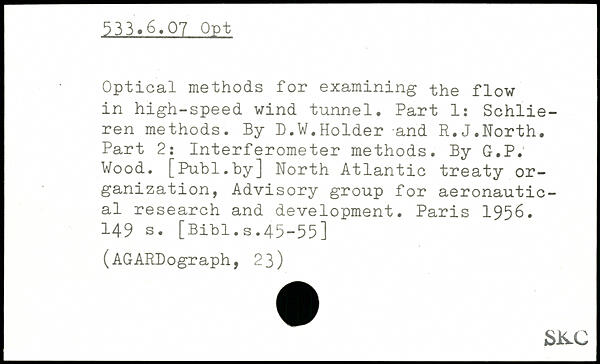 Optical methods for examining the flow in high-speed wind tunnel. Part 1: Schlieren methods. By D.W.Holder and R.J.North. Part 2: Interferometer methods. By G.P.1 Wood.