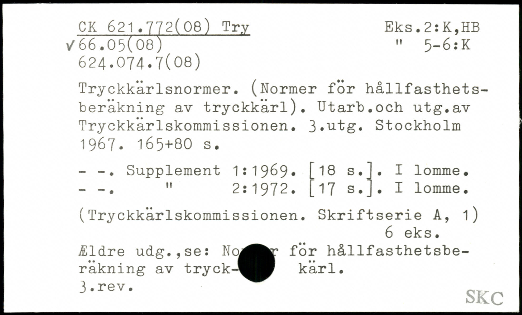 Tryckkärlsnormer. (Normer for hållfasthets-beräkning av tryckkärl). Utarb.och utg.av Tryckkårlskommissionen. 3.utg.