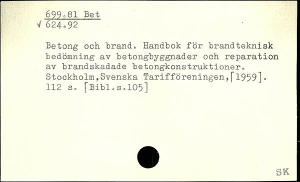 Betong och brand. Handbok för brandteknisk ! bedömning av betongbyggnader och reparation av brandskadade betongkonstruktioner. Stockholm,Svenska Tarifföreningen, [ 1959].