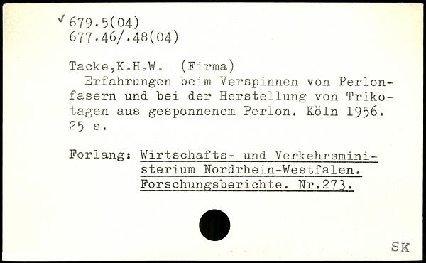 Tacke,K.H=W, (Firma) Erfahrungen beim Verspinnen von Perlonfasern und bei der Herstellung von Trikotagen aus gesponnenem Perlon.