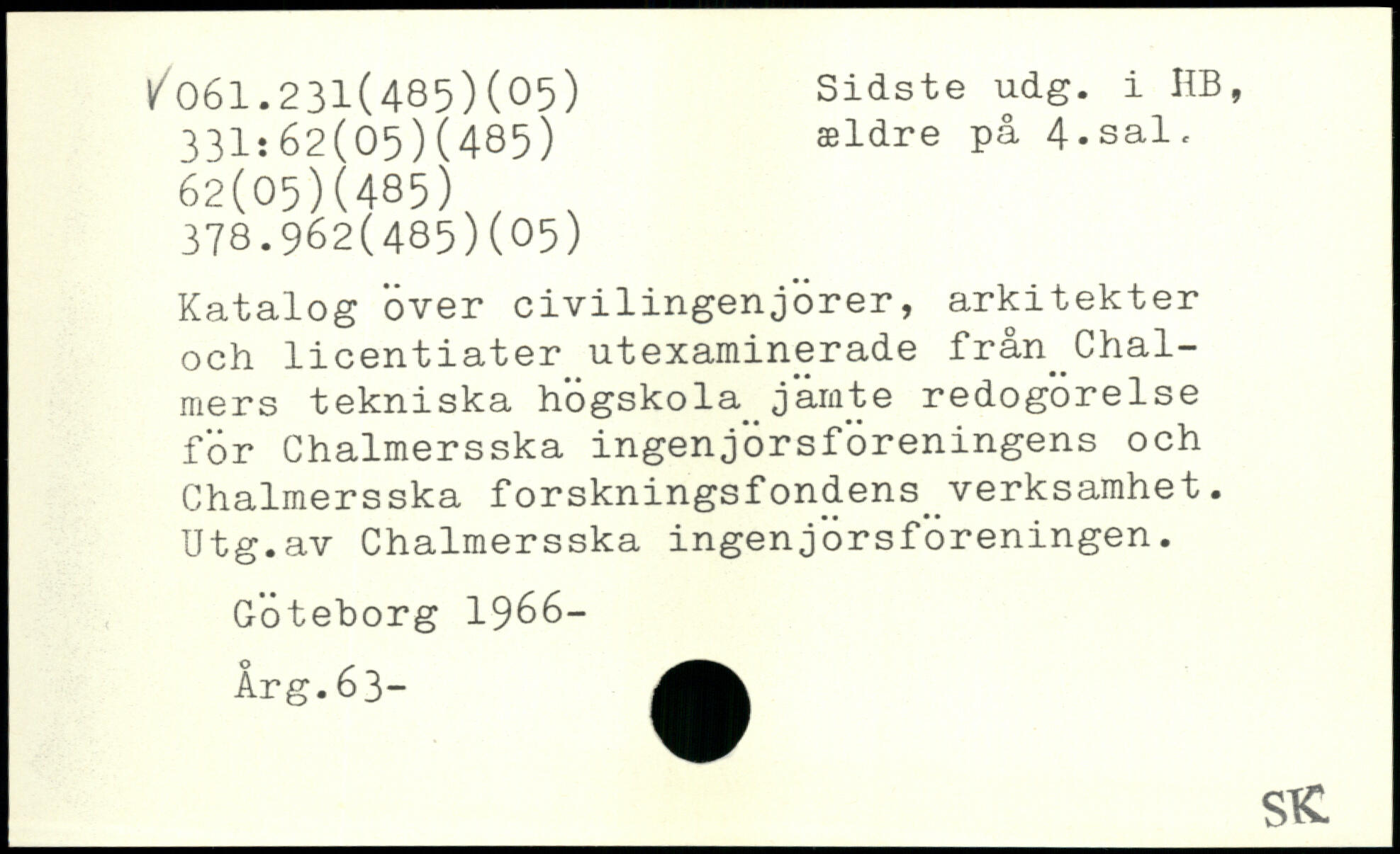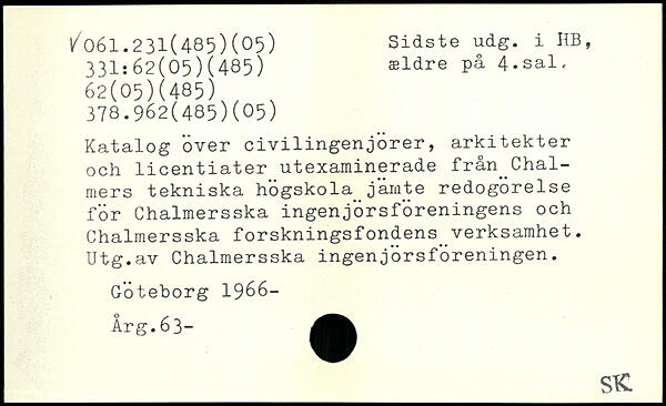 Katalog över civilingenjörer, arkitekter och licentiater utexaminerade från^Chal-mers tekniska hogskola järnte redogorelse för Chalmersska ingenjörsföreningens och Chalmersska forskningsfondens^verksamhet. Utg.av Chalmersska ingenjörsföreningen. Göteborg 1966- Årg.63-