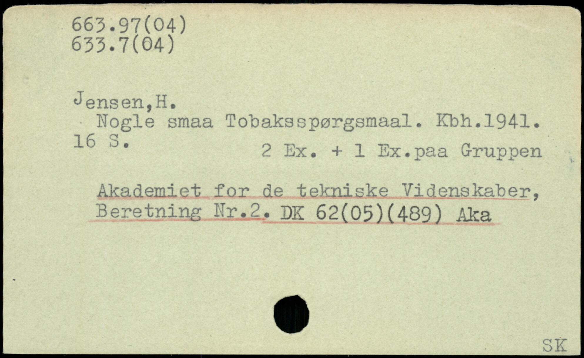 Nogle smaa Tobaksspørgsmaal. Kbh.1941. 2 Ex. +1 Ex.paa Gruppen Akademiet for de tekniske Videnskaber, Beretning Nr.2. W, 62(05)(489) Aka