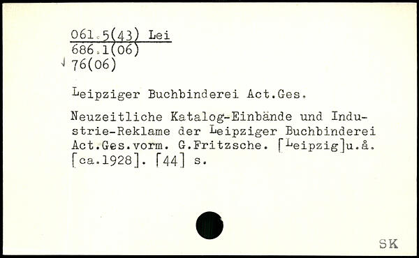 leipziger Buchbinderei Act.Ges. Neuzeitliche Katalog-Einbände und Industrie-Reklame der leipziger Buchbinderei Act.Ges.vorm. G.Fritzsche. f^eipzig]u.ä. [ca.1928]. T44] s.