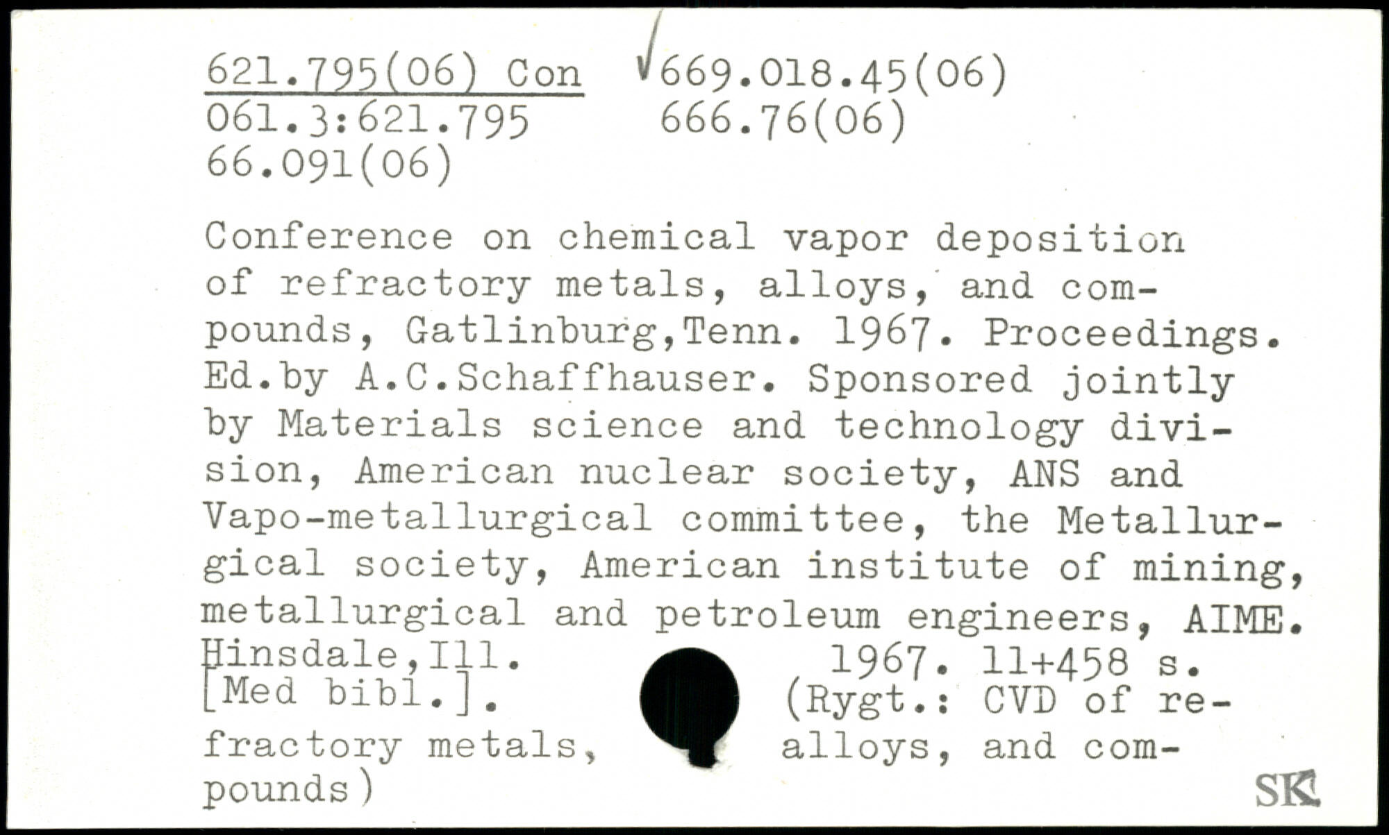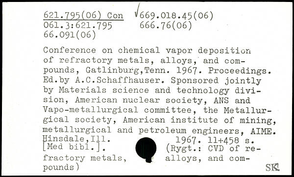 Conference on chemical vapor deposition of refractory metals, alloys, and compounds, Gatlinburg,Tenn. 1967, Proceedings. Ed.by A.C.Schaffhauser. Sponsored jointly by Materials science and technology division, American nuclear society, ANS and Vapo-metallurgical committee, the Metallurgical society, American institute of mining, metallurgical and petroleum engineers, AIME. Hinsdale,111. 1967.