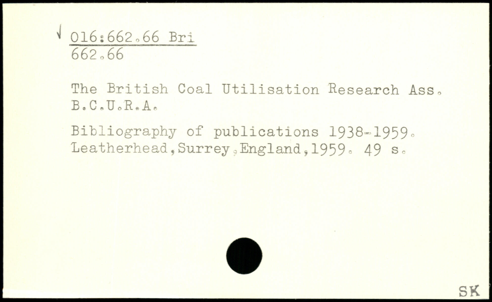 The British Coal Utilisation Research Ass. B.C.ÏÏoR.A. Bibliography of publications 1938-1959o Leatherhead,Surrey.England.1959=