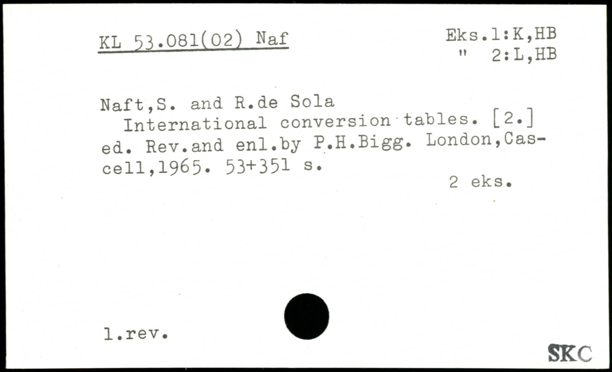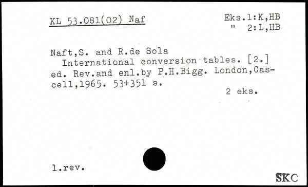 Naft,S. and R.de Sola International conversion■tables. |_2.J ed. Rev.and enl.by P.H.Bigg.