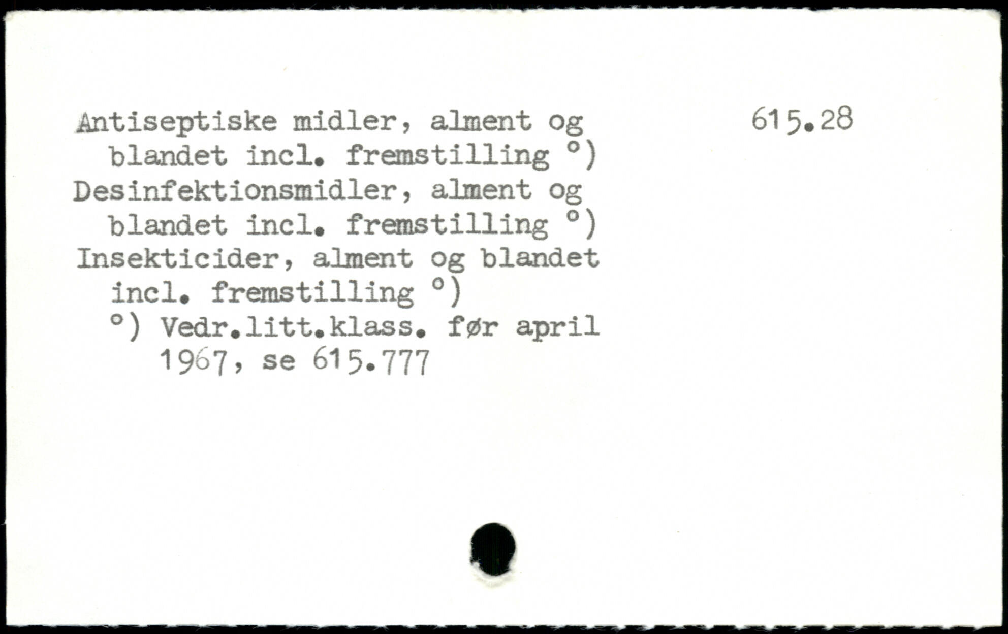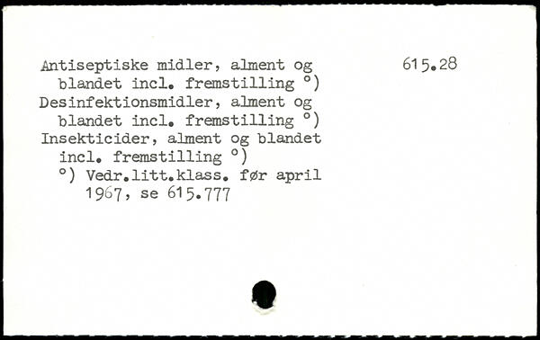 Antiseptiske midler, alment og 615.28 blandet incl. fremst1111ng .) Desinfektionsmidler, alment og blandet incl, fremst1111ng .) Insekticider, alment og blandet incl. fremst1111ng .) .) Vedr.litt.klass. før april 1967, se 615.777