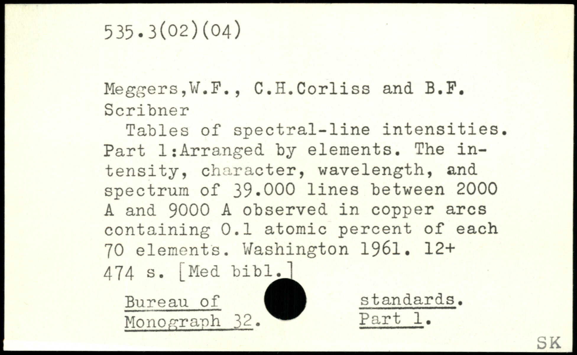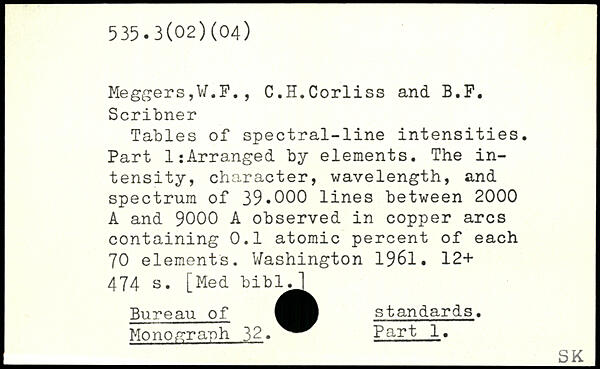 Meggers,W.P., C.H.Corliss and B.F. Scribner Tables of spectral-line intensities. Part 1:Arranged by elements. The intensity, character, wavelength, and spectrum of 39.000 lines between 2000 A and 9000 A observed in copper arcs containing 0.1 atomic percent of each 70 elements.