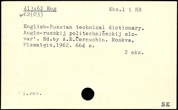 English-Russian technical dictionary. Anglo-russkij politechniceskij slo-var'. Ed.by A.E.Cernuchin.