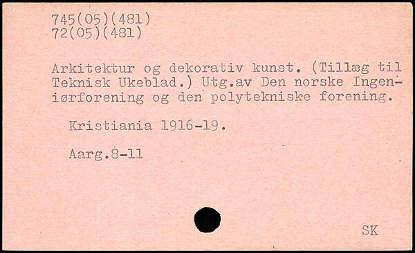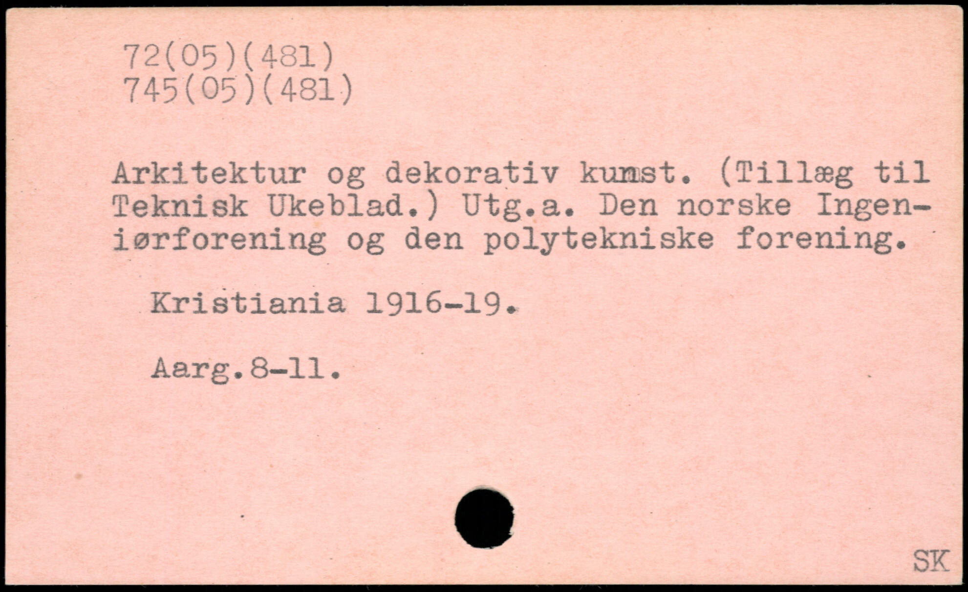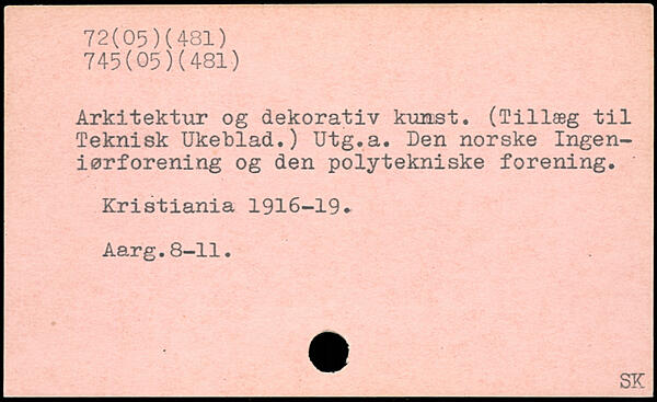 Arkitektur og dekorativ kunst. (Tillæg til Teknisk Ukeblad.) Utg.a. Den norske Ingeniørforening og den polytekniske forening. Kristiania 1916-19. Aarg.8-11.