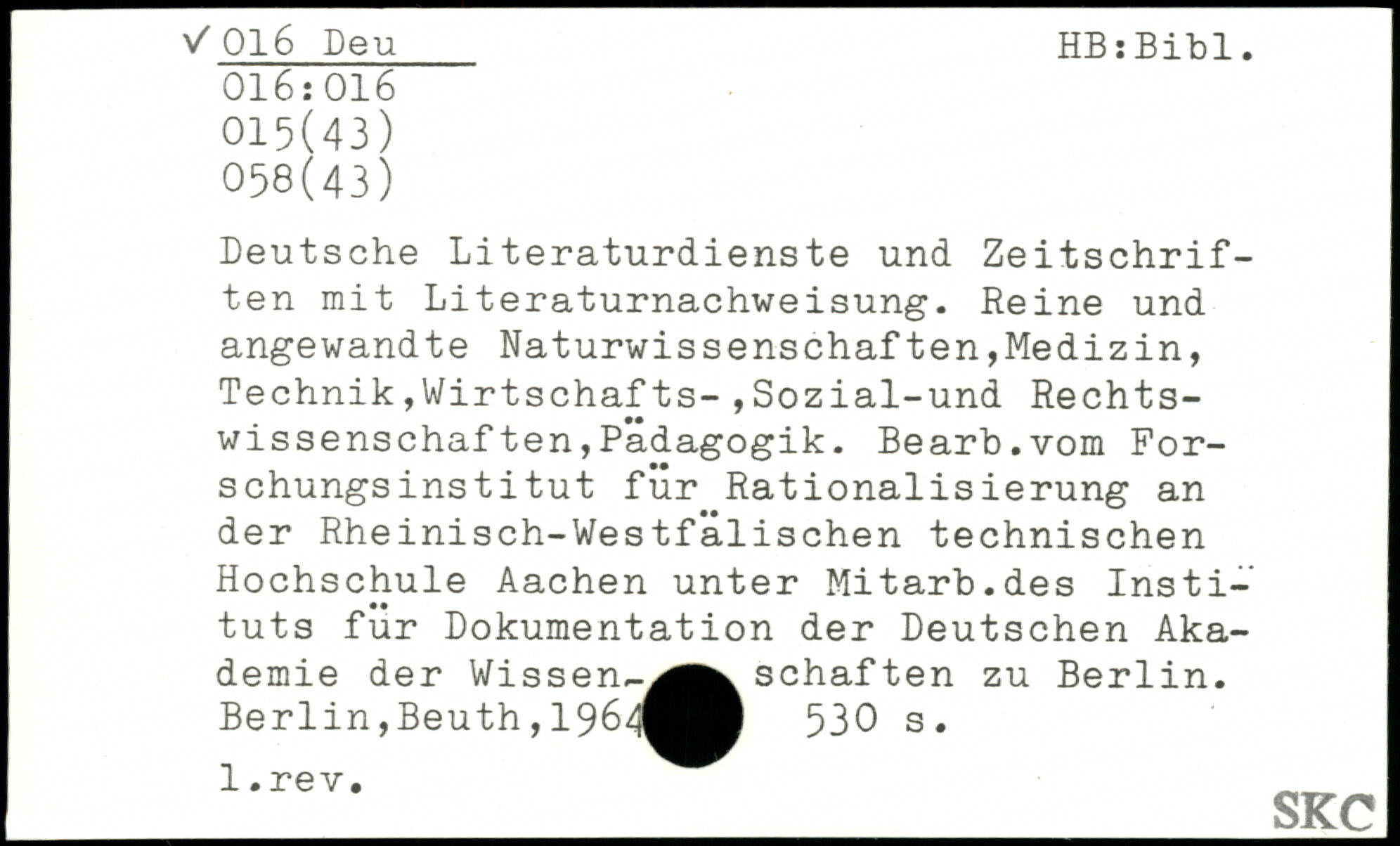 Deutsche Literaturdienste und Zeitschriften mit Literaturnachweisung. Reine und angewandte Naturwissenschaften,Medizin, Technik,Wirtschafts-,Sozial-und Rechtswissenschaf ten,Pädagogik. Bearb.vom Forschungsinstitut für Rationalisierung an der Rheinisch-Westfalischen technischen Hochschule Aachen unter Mitarb.des Insti-tuts für Dokumentation der Deutschen Akademie der Wissen-^^^ schaften zu Berlin. Berlin,Beuth, 196-^i^^B