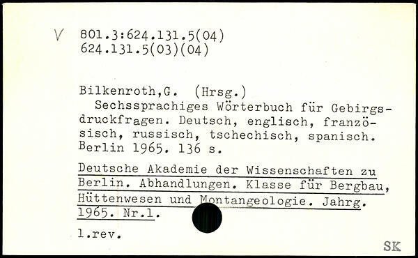 Sechssprachiges Wörterbuch für Gebirgs-druckfragen. Deutsch, englisch, französisch, russisch, tschechisch, spanisch.