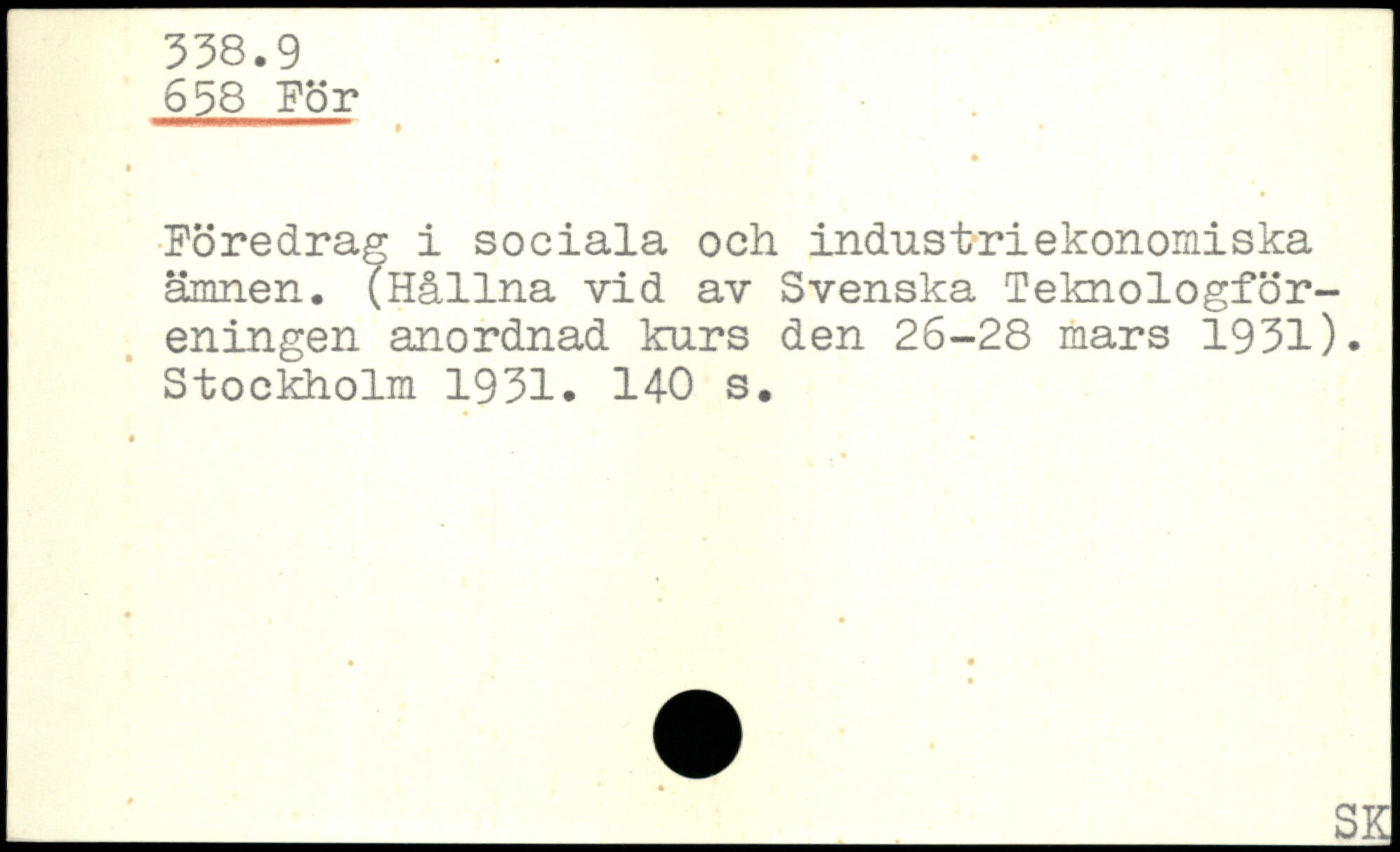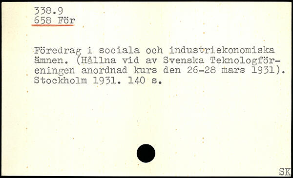 Föredrag i sociala och industriekonomiska ämnen. (Hållna vid av Svenska Teknologiöreningen anordnad kurs den 26-28 mars 1931).
