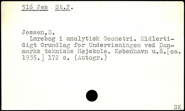 Lærebog i analytisk G-eometri. Midlertidigt G-rundlag for Undervisningen ved Danmarks tekniske Højskole. København u.å.[ea. 1935.]