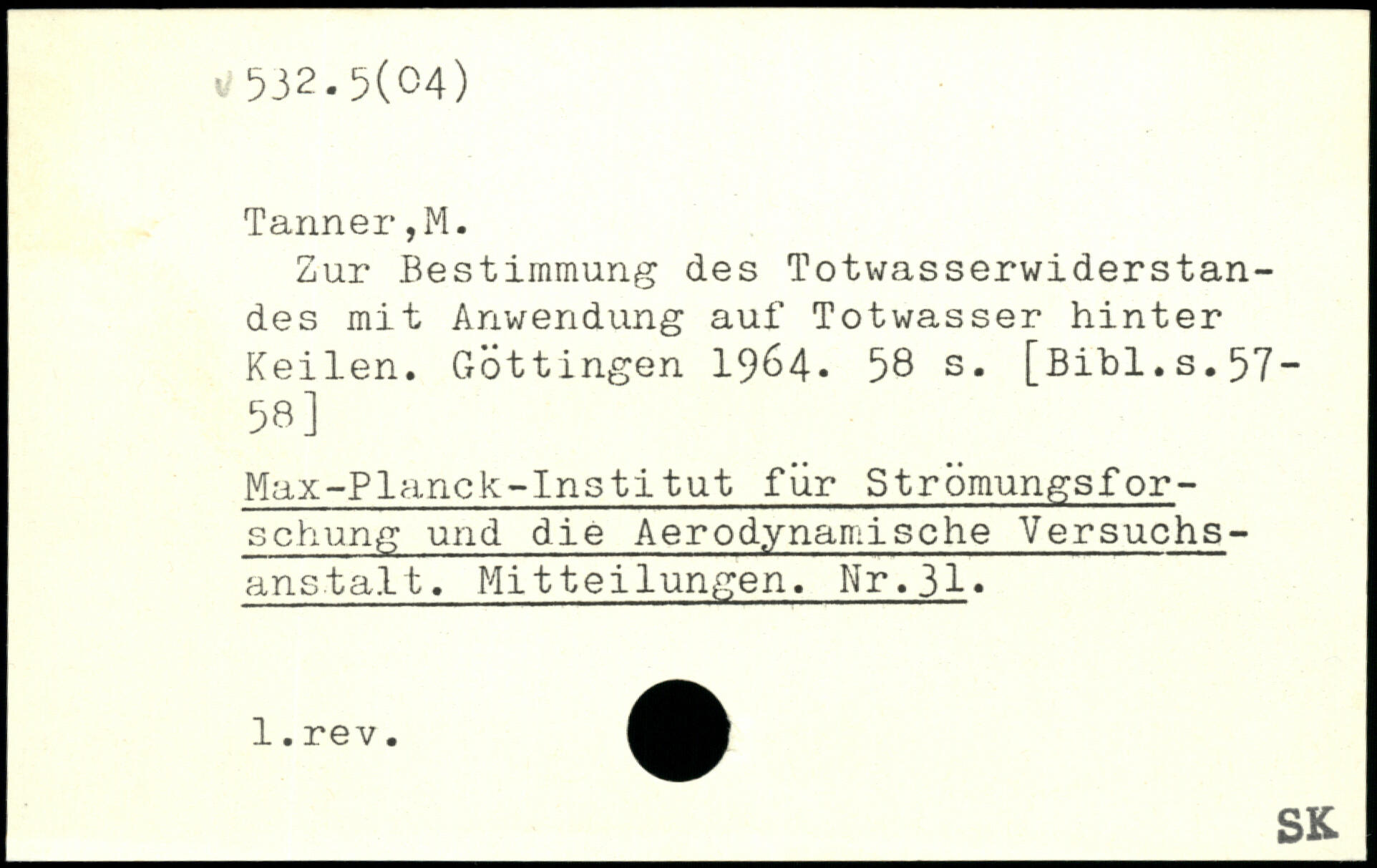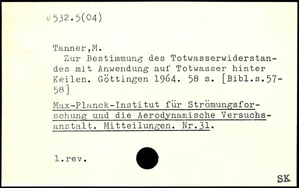 Sur Bestimmung des Totwasserwiderstandes mit Anwendung auf Totwasser hinter Keilen. Göttingen 1964.